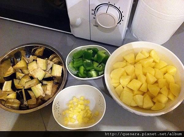 3. 將茄子、青椒洗淨,切成塊狀備用。