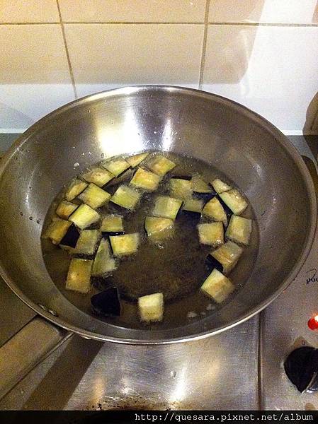 6. 放入茄子,大約炸5分鐘後撈起瀝乾。