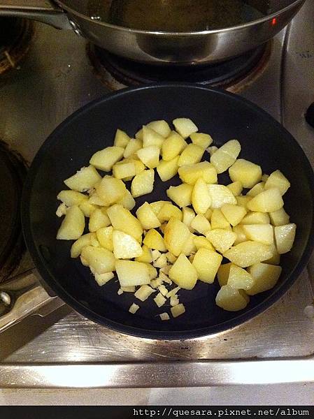 5. 熱油鍋,放入馬鈴薯塊,炸至透明金黃色時撈起瀝乾。