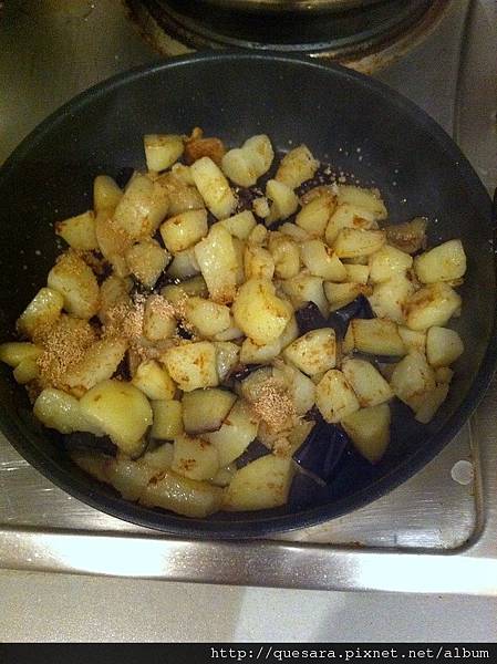 9. 之後加入步驟5中的茄子與鍋中馬鈴薯塊一起翻炒,並撒入適量鰹魚粉。