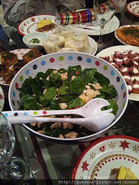 3. 取一大沙拉碗,鋪上菠菜葉,再擺上切好的雞胸肉、荔枝、彩椒和辣椒,最後淋上步驟2的醬汁拌勻即可